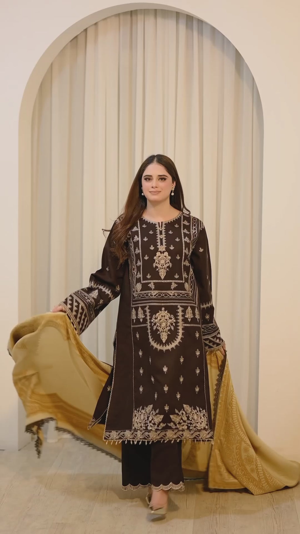 This Embroidered Suit combines elegant craftsmanship with quality fabrics. The shirt features intricate embroidery on the front and sleeves, complemented by a dyed back and a embroidered patti at the hem for a refined finish. The premium dhanak dyed trouser ensures comfort and durability, while the emboss velvet shawl adds warmth and sophistication. Ideal for those seeking a blend of traditional artistry and modern comfort.