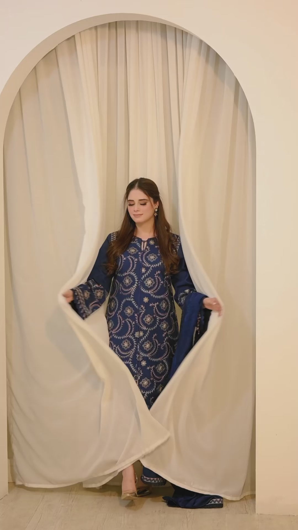 This elegant 3-piece suit features a 100% dhanak shirt with intricate embroidery on the front and sleeves, complemented by a dyed back and a yard embroidered hem patti for a refined finish. The matching dhanak trousers offer comfort and durability, while the emboss velvet shawl with detailed embroidery completes the ensemble, providing warmth and style. Perfectly balanced for both formal and semi-formal occasions, this outfit combines quality fabrics with expert craftsmanship for a sophisticated look.