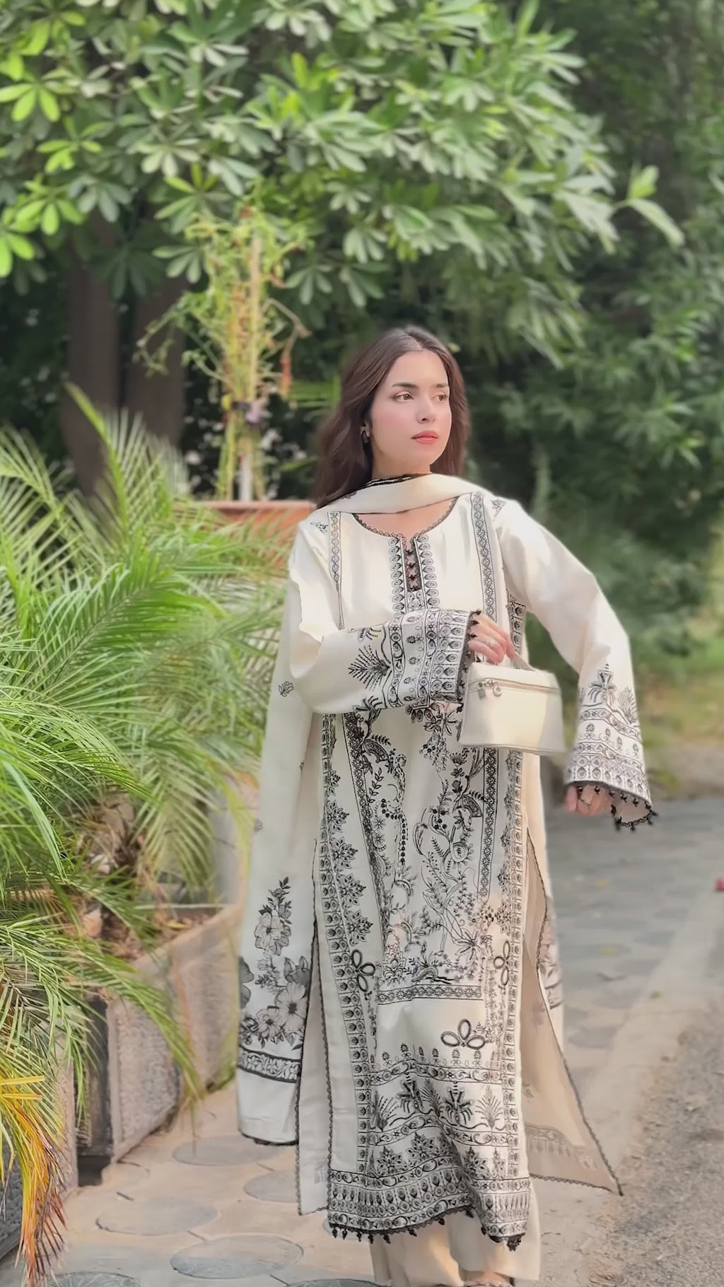 This Subtle Maze 3PC Embroidered Suit features a finely detailed Libaas embroidery adorning the front and sleeves of the shirt, paired with a dyed embroidered back. Complemented by embroidered shirt and an emboos velvet shawl, this suit offers a cohesive and refined ensemble perfect for formal occasions or festive wea.